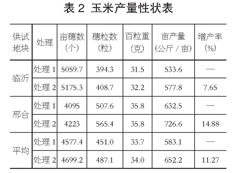 测产时,对2个处理组各选定3个样点测产。每个样点量10个行距计算平均行距,在10行之中选取有代表性的20米双行,计数株数和穗数,并计算亩穗数;在每个测定样段内每隔5穗收取一个果穗,共计收获20穗作为样本测定穗粒数。以亩穗数、穗粒数、百粒重再按八五折计算理论亩产量。具体结果见表2。