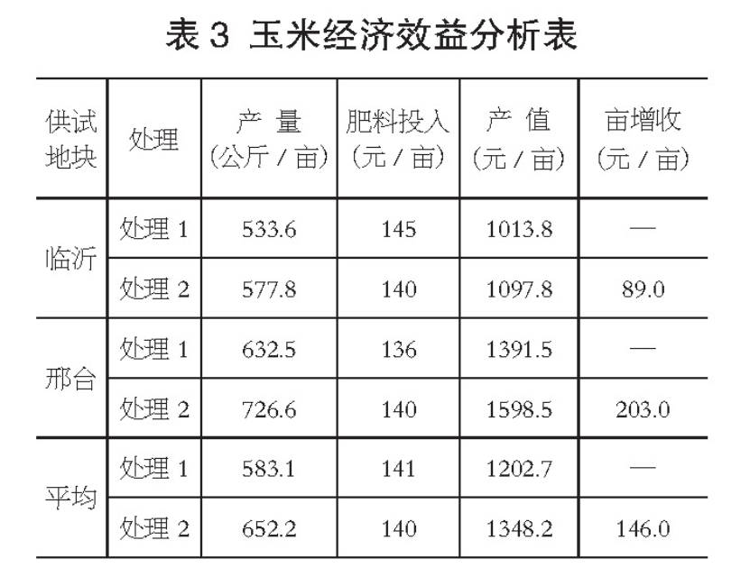 从表2玉米产量性状表可见,“芯聚天”增效复合肥处理穗粒数比对照处理平均多36.1粒,百粒重比对照重0.3g,理论产量比对照平均增加69.1公斤/亩,平均增产率达11.27%。从表3玉米经济效益分析表可见,“芯聚天”增效复合肥比常规施肥的玉米平均亩净增收146.0元。此外,较对照处理可进行种肥同播,省去肥料掺混步骤,节省劳动力和时间,省时省工。