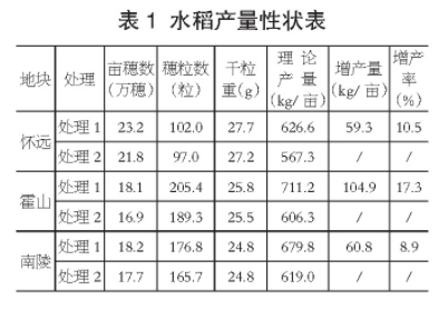 由表1可看出:与农户常规施肥(对照)相比,红四方缓释掺混肥处理区无论是亩成穗数、穗粒数还是粒重都有所增加,亩产量提高。3个示范点缓释掺混肥处理区相较对照(农户习惯)处理平均增产率为12.2%。